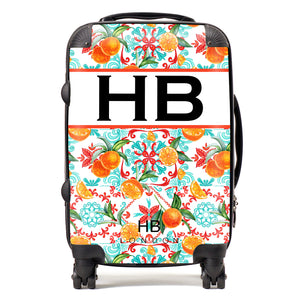 Travel in style with our Personalised Sicilian Orchard Initial Suitcase, inspired by the vibrant charm of the Mediterranean. This unique design features a bold tile pattern in red and green tones, decorated with vibrant oranges and Mediterranean florals.